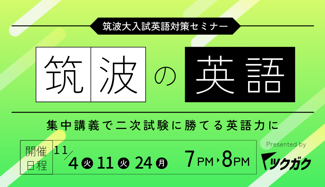 筑波大学受験専門オンライン家庭教師「ツクガク」では、筑波大学を志望する受験生向けに、【筑波大英語】筑波大二次試験入試 「英語」解説講座を実施します!本イベントでは実際に、現役の筑波大生もお呼びし、筑波大学入試英語の出題傾向や対策を、実際に問題演習をお伝えする時間となります。奮ってご参加ください。*参加者様からのご質問も自由にお答えします。