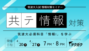 こんにちは!ツクガク事務局です! 新高校3年生の皆様、学習状況はいかがですか? 「新課程」がスタートし、共通テストに置いて「情報I」が必要になってから早3年目。筑波大学の共通テストにおいても、軽減措置が減り、情報の配点が … 続きを読む 筑波大入試必須科目「情報I」のオンライン解説講座